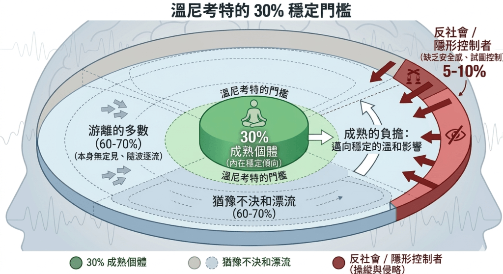 英國精神分析大師溫尼考特(D. W. Winnicott)在 1950 年發表的經典文獻中,提出了一個深具啟發性的觀點:一個群體永遠不可能 100% 由心理成熟、絕對健康的人所組成。 因此,維持一個機制良善運作的關鍵,在於社會中必須存在「足夠比例」的成熟個體來發揮穩定作用,而他推測這個實務門檻,大約落在 30%。